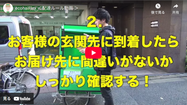 都内近郊や首都圏エリアを中心に格安料金で自転車配達をするECO配では、YouTubeを活用して、スタッフへの配達ルールを共有しています。