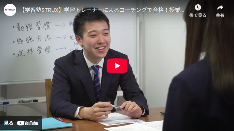 こちらは学習塾STRUXの動画になります。この動画では『学習塾でいかに勉強のみに集中した環境が作れるのか?』や合格実績を公開しています。