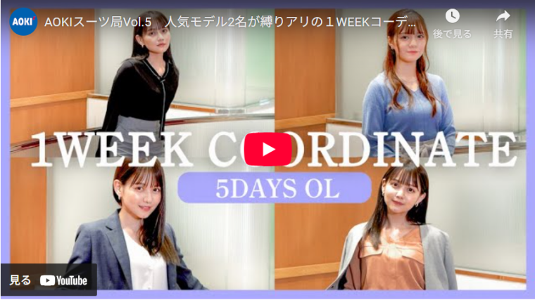 こちらも同様にオフィスカジュアルを発信する動画になります。AOKIはyoutube内でAOKIスーツ局と呼ばれるチームを設立しており、AOKIの服を着た人気モデル達が面白い企画に挑戦し、スーツの魅力を発信しています。