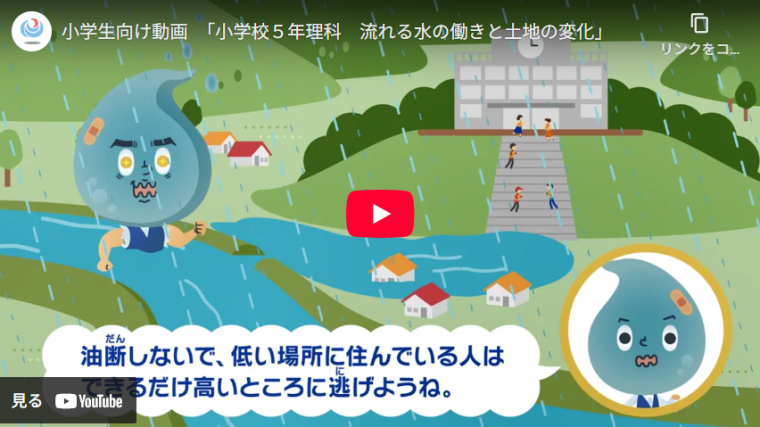 国土交通省の制作した動画では、「洪水の仕組み」を小学生に理解してもらうため、アニメーションを活用して視覚的に分かりやすく解説をしています。