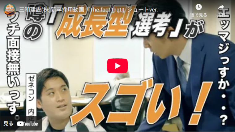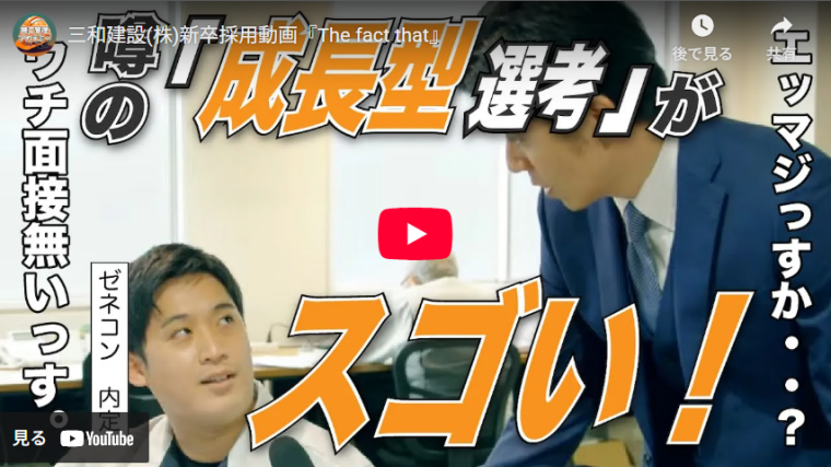 三和建設の新卒採用動画は、フリーアナウンサーとして活躍する青木源太さんを起用したインタビュー風の内容となっています。