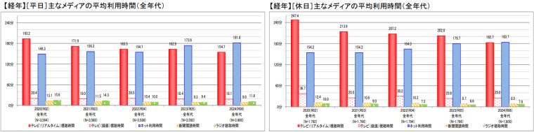 この調査結果から分かるのは、インターネットが、全年代で最も長く利用されるメディアになった点です。全年代平均でみると、平日は「インターネット」が181.8分、休日は183.7分と、いずれも「テレビ(リアルタイム)」の視聴時間(平日154.7分、休日182.7分)を上回っています。