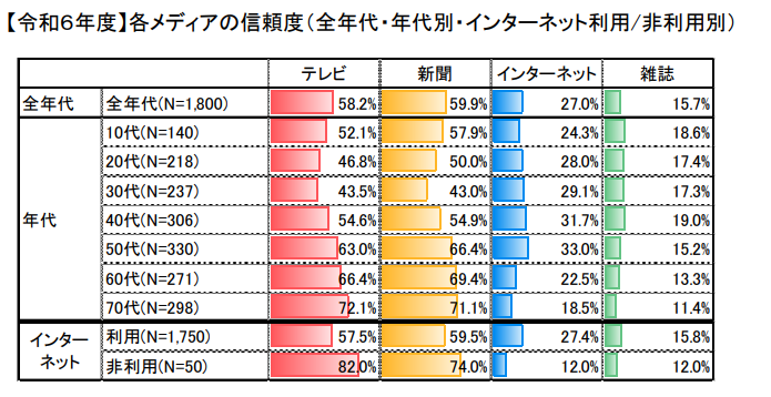ただし、30代と70代ではテレビへの信頼が上回っており、世代によって信頼を置くメディアの傾向が異なっています。つまり、「テレビは広く届く情報源」「新聞は信頼の担保」「インターネットはスピードと多様性」という棲み分けが見えてきます。