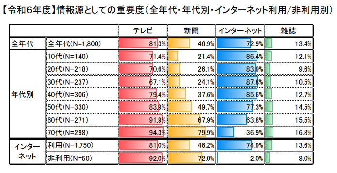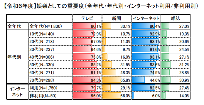「娯楽としての重要度」では、インターネットが80.4%と突出しており、特に若い世代では動画やSNSなどを通じて日常的に楽しみを得ている傾向が強いです。一方、50代から70代では「テレビ」が依然として高い割合です。