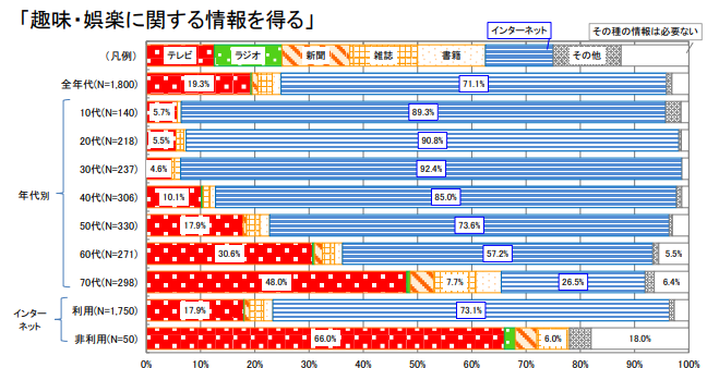 「趣味・娯楽に関する情報を得る」点では、全年代でインターネット(71.1%)が最も利用され、特に10代〜60代に広く浸透しています。70代ではテレビが優勢です。