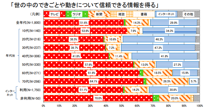 「信頼できる情報を得る」目的では、全体ではテレビが51.6%と優勢ですが、20〜30代ではインターネットの信頼性が高まり、40代では両者が拮抗しています。60代・70代ではテレビが依然として強い支持を得ています。
