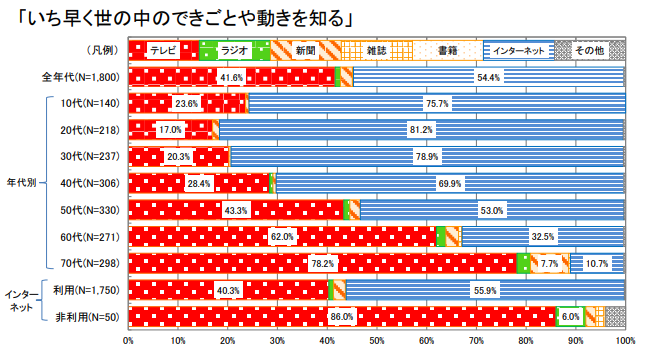 「いち早く世の中の出来事を知る」目的では、全世代でインターネットが54.4%と最も高く、特に10代〜50代では圧倒的にネットが主流です。一方で、60代・70代ではテレビが依然として強い支持を得ています。